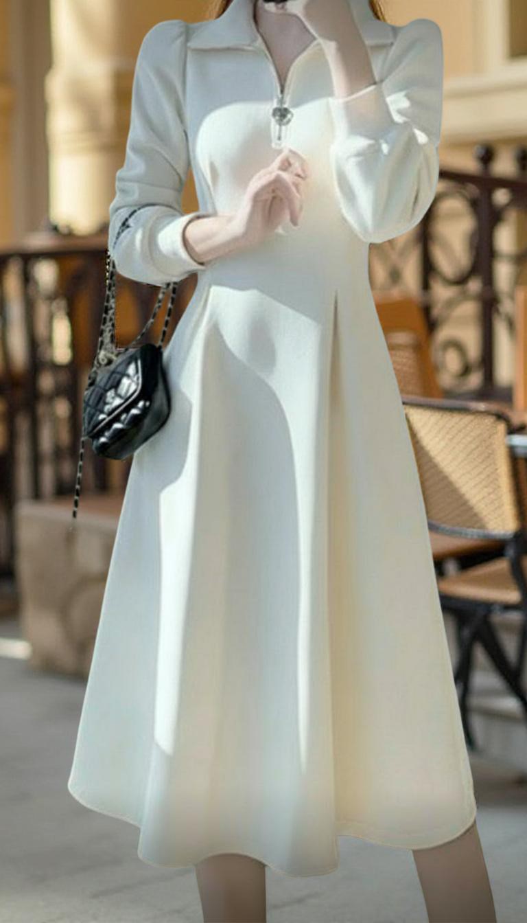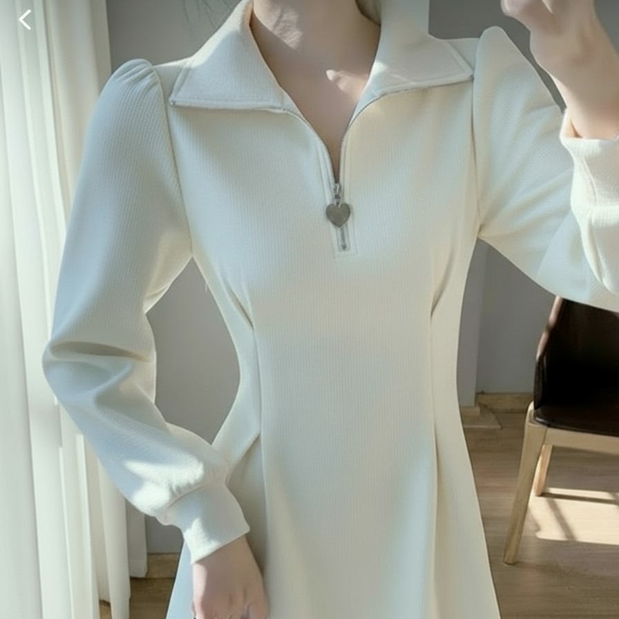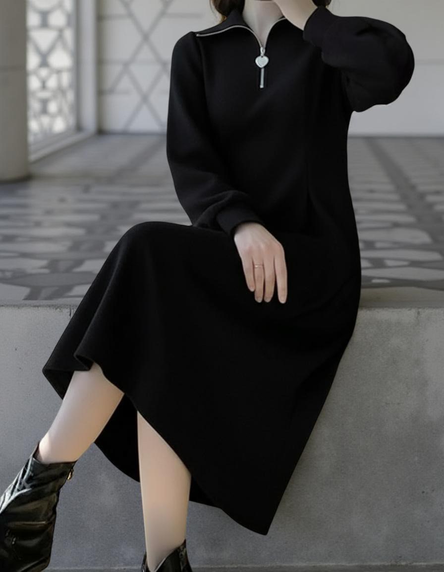 Crafted from a soft, fluid fabric that drapes beautifully, this midi dress features a flattering A-line silhouette that moves with grace. The sophisticated collared neckline adds a polished touch, while the unique quarter-zip front, adorned with an adorable heart-shaped pull, allows for adjustable styling and a hint of playful charm. Long, comfortable sleeves with a subtle puff detail at the shoulder and neat cuffs complete the refined look.
