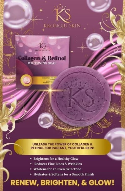 The Kkongju Skin Collagen and Retinol Whitening Soap is a skincare product designed to brighten and improve skin tone, reduce dark spots and wrinkles, and promote a smoother, more youthful complexion. It uses active ingredients like collagen, which provides firmness and elasticity, and retinol, which boosts collagen production, speeds up cell turnover, and reduces the signs of aging. The soap also aims to provide deep hydration and gentle cleansing for all skin types, leaving skin looking brighter, smoother, and more radiant.Â