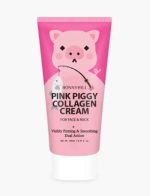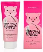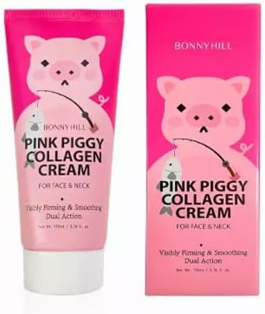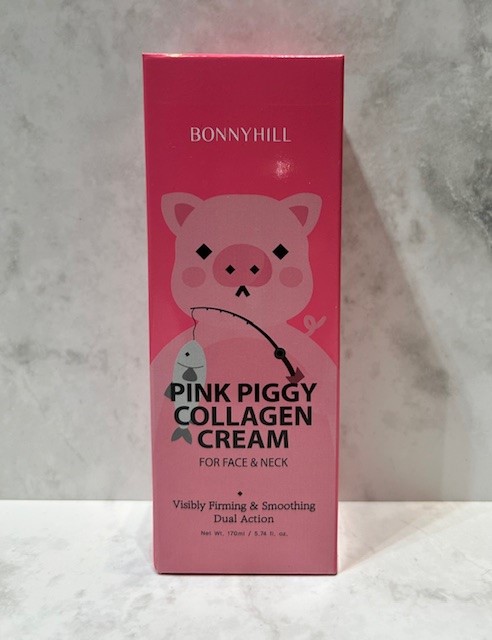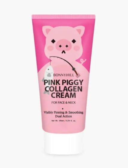 The Bonnyhill Pink Piggy Collagen Cream is a 170ml K-beauty moisturizer for the face and neck, featuring hydrolyzed collagen and collagen extract to firm and smooth the skin, enhance elasticity, and provide a bouncy, youthful glow. The cream is suitable for all skin types, has a pink, illuminating appearance, a delicate rose scent, and aims to deliver lasting hydration and stress relief.Â