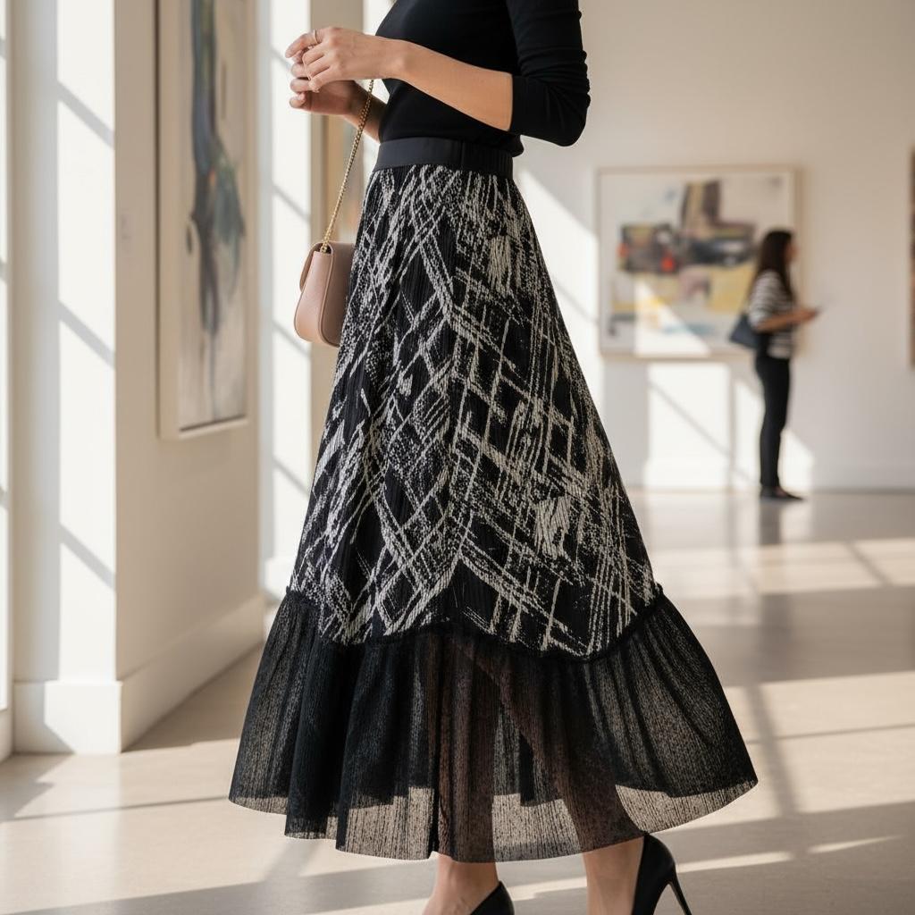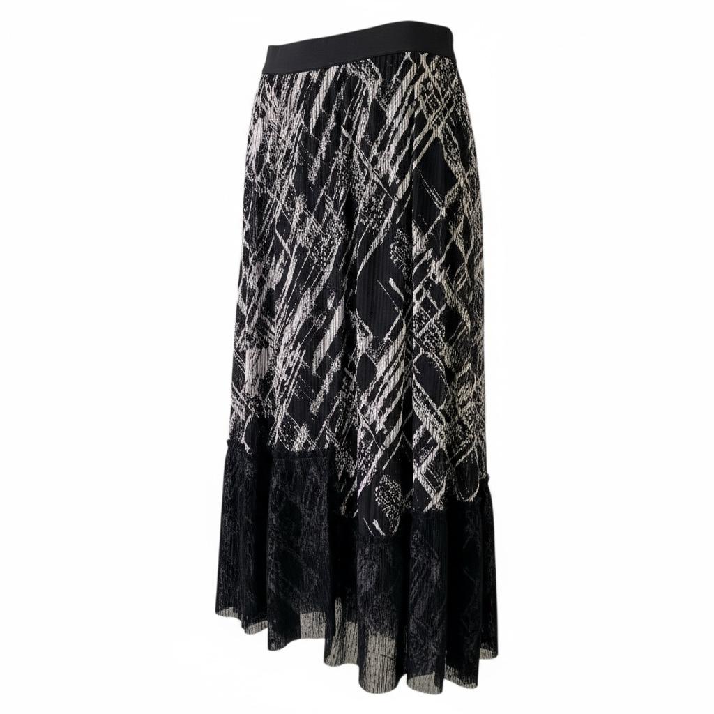 Ignite your wardrobe with the sheer drama of this captivating graphic skirt. This isn’t just clothing; it’s kinetic art designed for the modern muse. Featuring a mesmerizing, architectural scratch-print in stark black and white, the precise pleating creates a sense of constant, fluid motion. It’s an edgy yet sophisticated statement piece engineered to turn heads with every confident step you take.