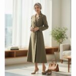 Flattering Silhouette: A subtle A-line skirt falls to an elegant midi length, offering a timeless and universally flattering shape. The defined waistline is accentuated by a fabric sash or the button closure, cinching the figure beautifully.