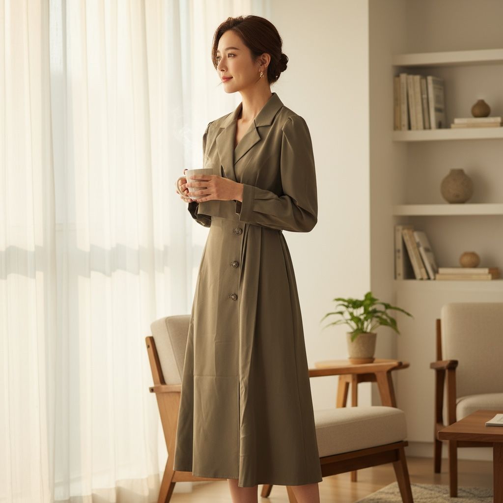Trench-Inspired Design: The dress features a classic notch lapel and a structured V-neckline, echoing the refined look of a trench coat or blazer.