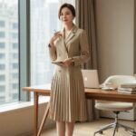 • Sculptural Flattery: The magic happens at the waist, where the tailored jacket flows into an immaculately crafted knife-pleated skirt. This A-line structure offers beautiful bounce and swing, ensuring a figure-flattering fit and a dynamic walk.