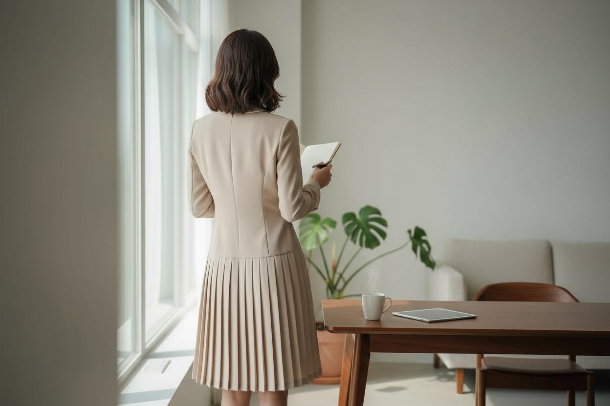 • Impeccable Construction: The fabric has a substantial, quality feel that holds the shape of the pleats and provides a clean, smooth drape. It’s designed for the woman who demands both elegance and utility.