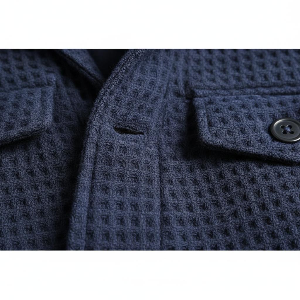 • Distinctive Textured Fabric: Crafted from a rich deep navy blue fabric featuring a captivating, subtle textured weave. This unique detail adds depth and visual interest, elevating it far beyond a basic jacket and providing a sophisticated tactile experience.