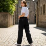 Unleash your inner icon with “The Midnight Muse Wide-Leg Denim,” a transformative pair of jeans designed for the bold, the effortlessly cool, and those who demand both comfort and cutting-edge style. These aren’t just black jeans; they’re a canvas for your individuality, crafted to make a powerful statement without saying a word. Back side is garterize.