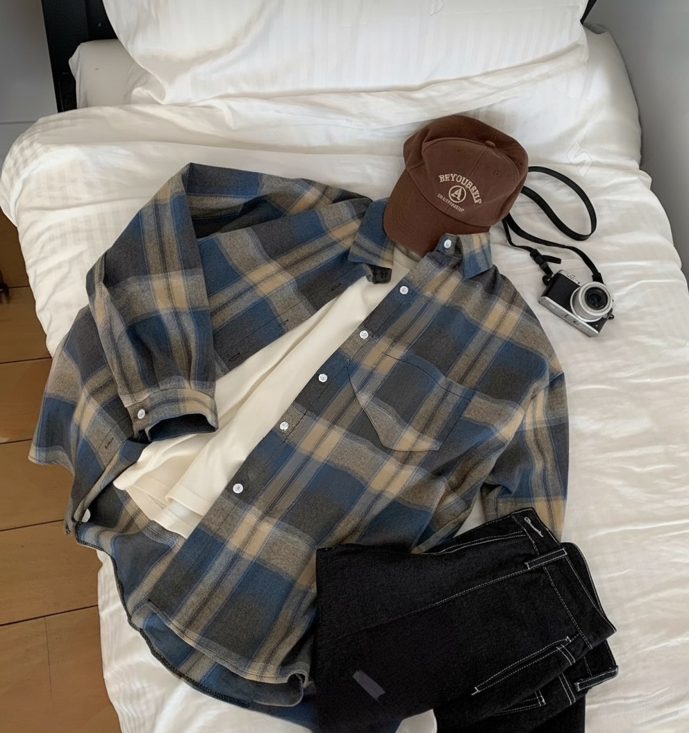 - Classic Meets Cool: Featuring a timeless plaid pattern in a captivating mix of earthy tan, deep slate grey, and vibrant denim blue (as seen in the main style), this shirt instantly gives any outfit a relaxed, vintage-inspired edge.